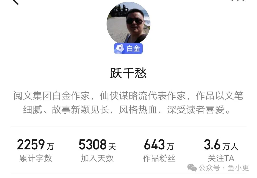 起点白金作家跃千愁,累计字数两千多万,粉丝六百多万,加入天数五千多天,总共创作有十多年了。