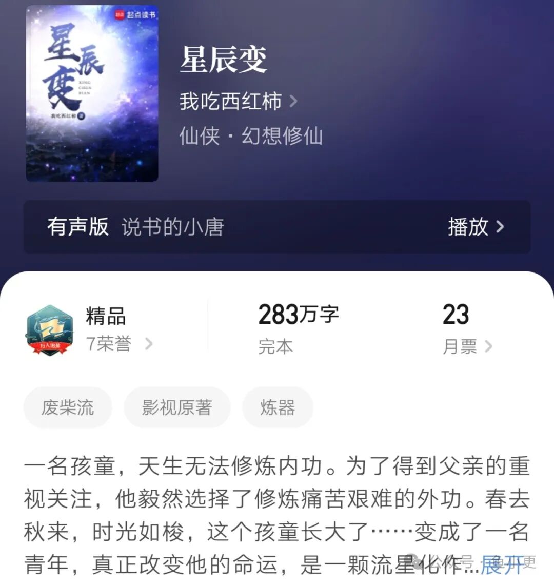《星辰变》算是一本老书了,更新于零七年,到现在差不多十四年,却还有不少读者去看,有些人看了好几遍都觉得不过瘾,可谓相当经典。