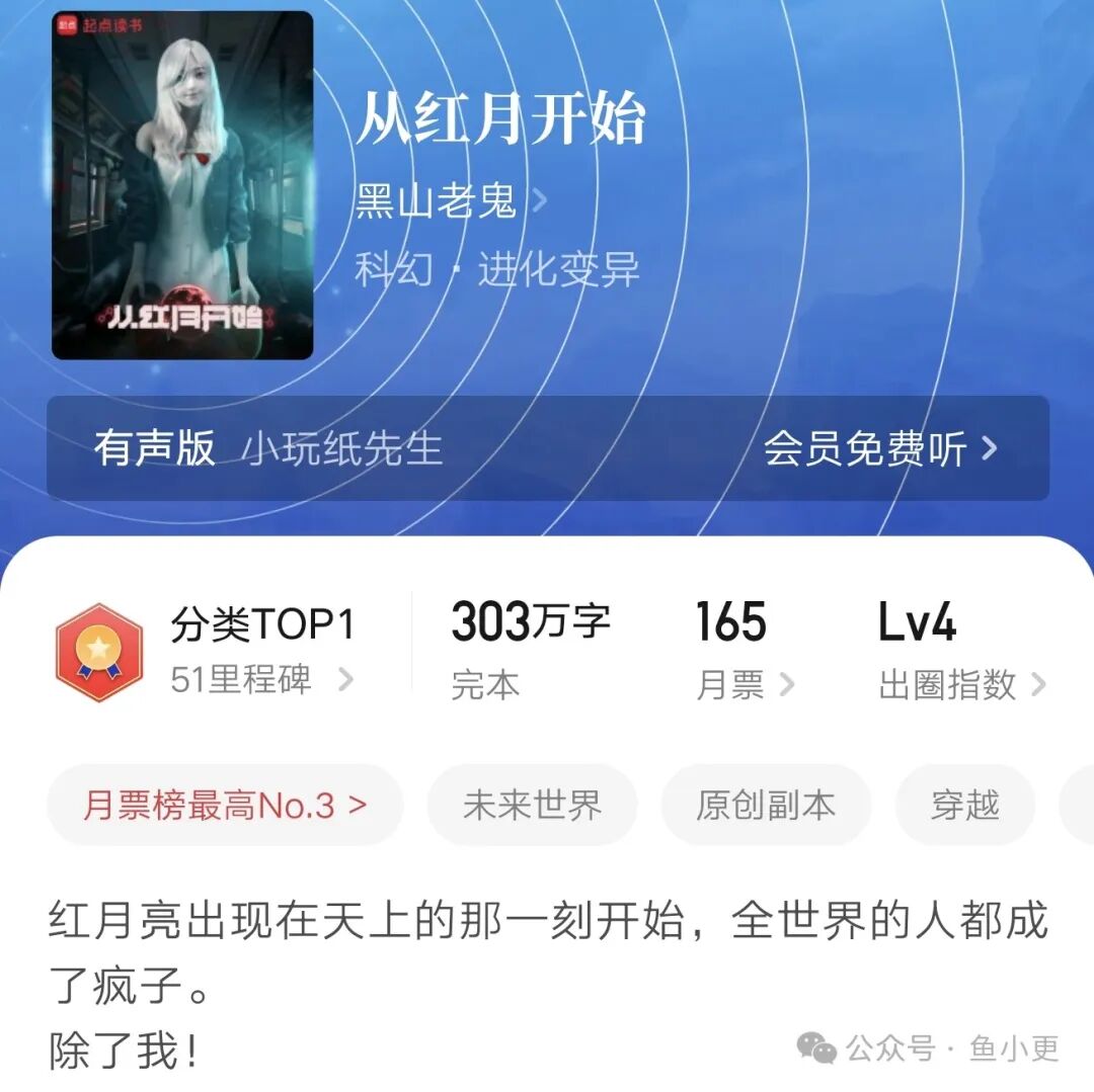 《从红月开始》分类榜第一,收藏量五十万起步,出圈指数四星,荣誉四星,以及获得上海图书馆百部精品小说之一。