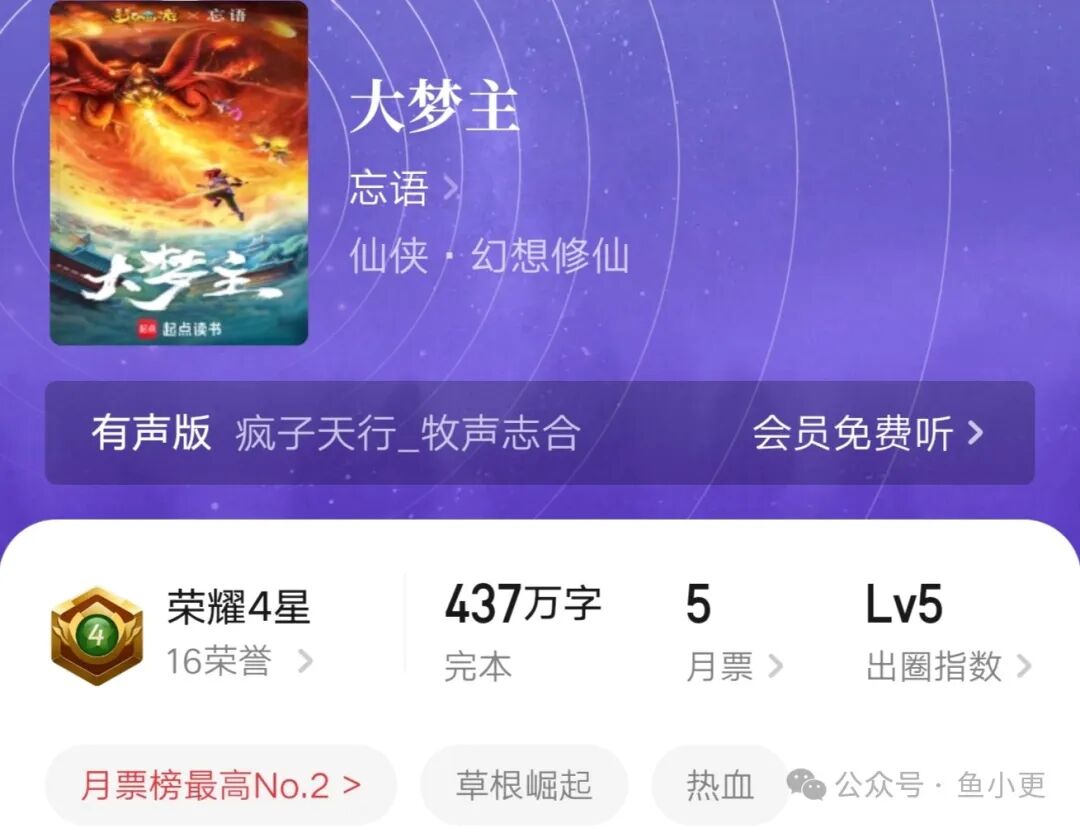 《大梦主》起点成绩感人。四百多万字就获得荣耀四星,出圈指数五级,均订一万以上。