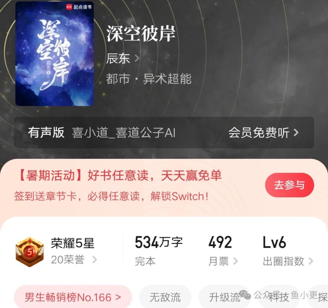 《深空彼岸》起点成绩:荣耀五星、年赛十强、季赛十强、入藏图书馆、收藏量五十万起步、均订超过十万、更难得出圈指数破六级,总分三百多万。