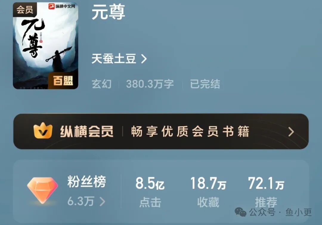 《元尊》纵横成绩:8.5亿点击量、18万收藏、72万推荐,入百盟,读者追捧严重。