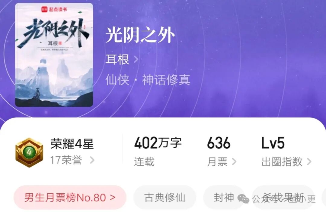 说真的,《光阴之外》这本书确实没啥看头,好多人或许是追着耳根的人气来看的,结果本书写得还不如上一本《三寸人间》。