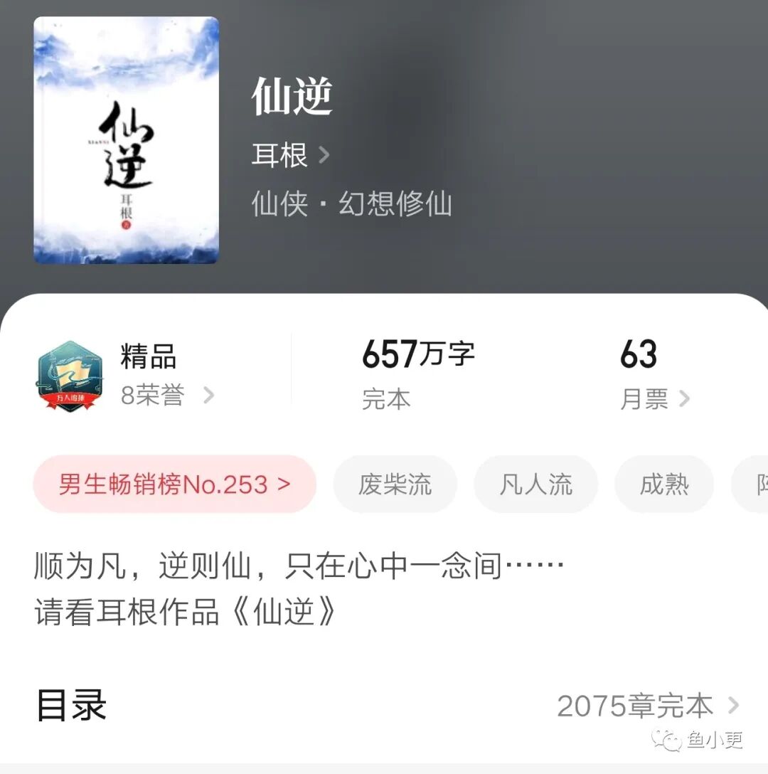不说《仙逆》能不能比肩《凡人修仙传》,但就单纯的时代产物,却让作者耳根直接成神,名气暴涨,从而获得起点白金作家称号。
