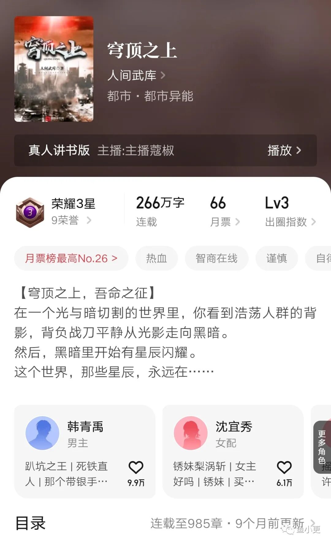 点评:这本书一八年上架,到如今二三年过了一半,差不多五年时间,总字数才写了两百多万。上一次更新还是在九个月以前,未来大概率是不会更新了,所以妥妥扑街文是跑不了的啦!