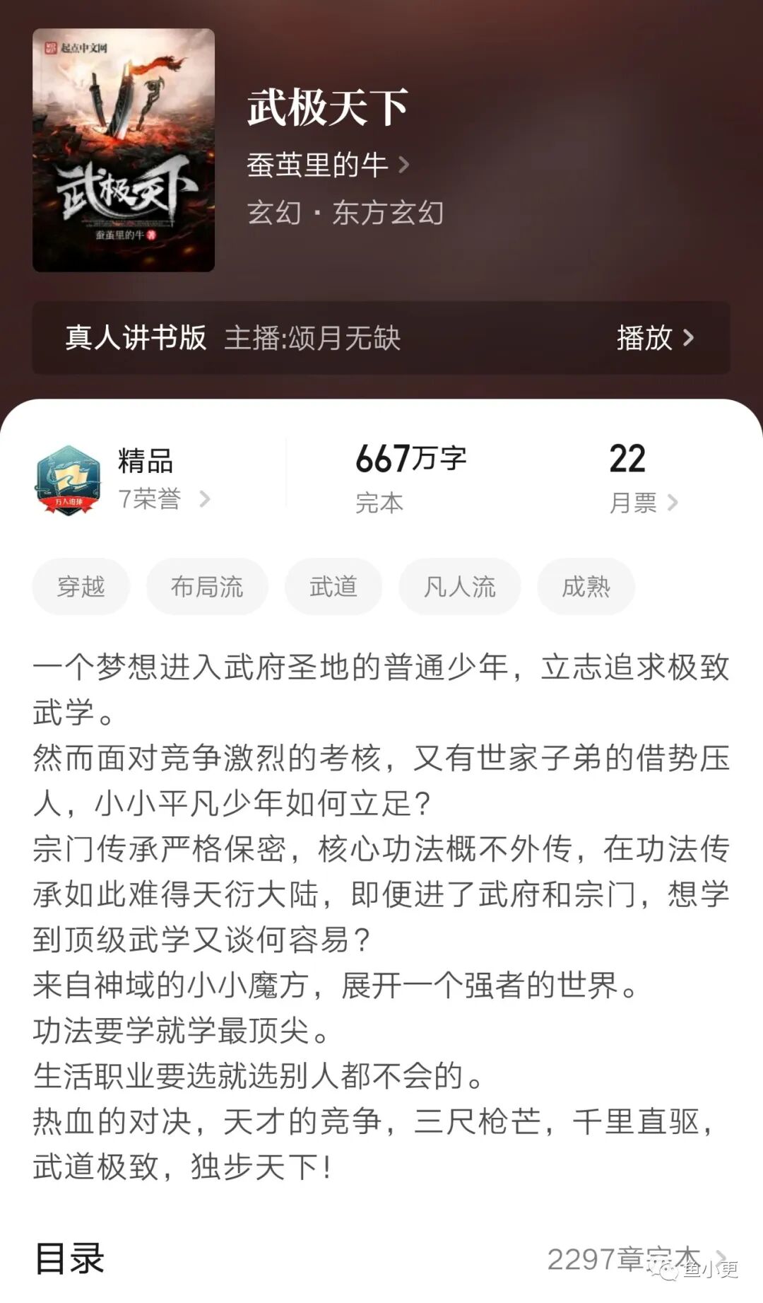 这位作者就是蚕茧里的牛,一本《武极天下》爆红起点,如今沦落写系统流,而且反响平平,想要重回巅峰基本无望了。那么小鱼就来介绍白金大神蚕茧里的牛五本书合集,感兴趣的小伙伴门可以往下看。