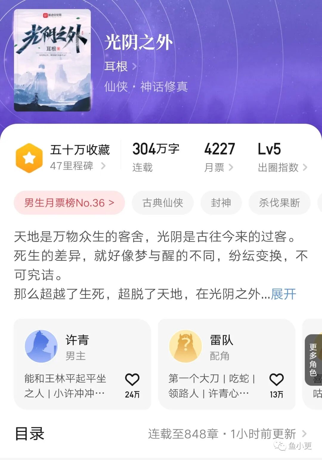 最近闲着没事,小鱼就追更了中原五白之一耳根写的《光阴之外》,一口气看了一百来章节。