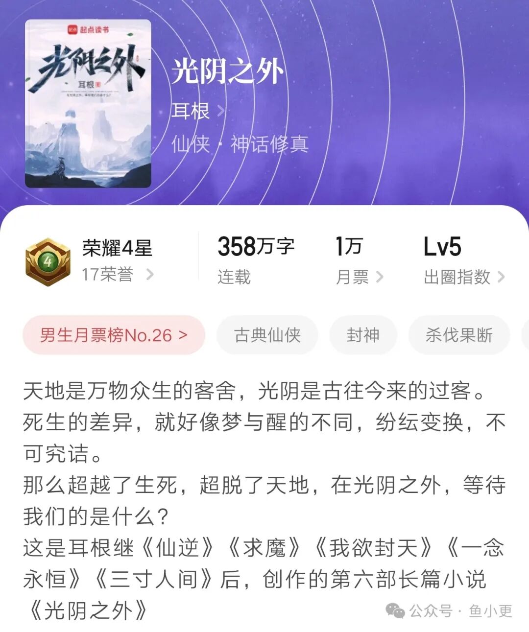 《光阴之外》是起点白金大神耳根第六本长篇小说。小鱼虽然不是他的忠实粉丝,但也看过他的好几本小说。特别是《求魔》和《仙逆》都看得十分热血,后面几本因为转型的缘故,所以就没那么好看了。