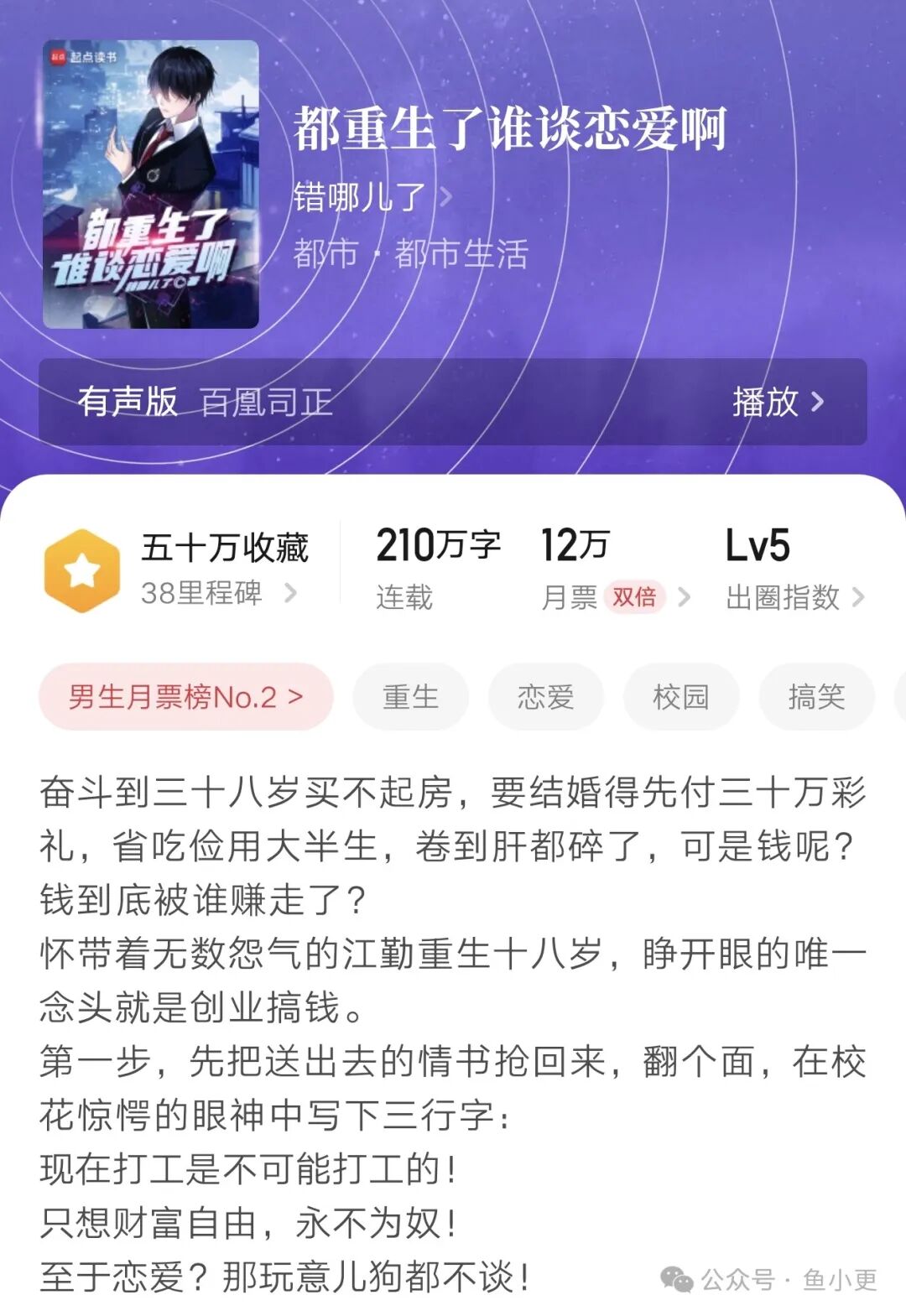 那么《都重生了谁谈恋爱啊》这本书真的有那么好吗?小鱼也追更了不少,可惜跟其他重生文大差不差,没有什么特别之处。