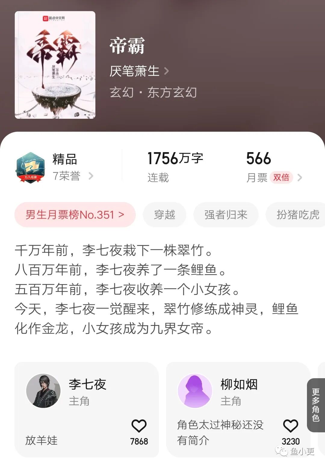 今天小鱼推《帝霸》这本书,无非就是要看得爽才有意思。哪怕水字数,但只要量大管饱,副本开得多,主角装十三,读者都很乐意买单的啦!要是没看过的小伙伴们,可以留意一下哈!