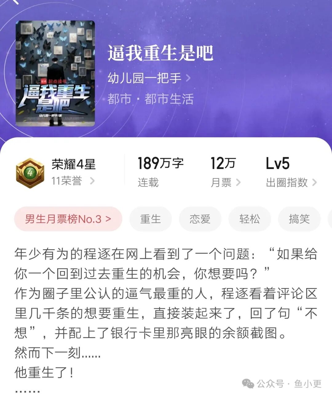 这本重生文不得了,小鱼记得好像有几个月荣获起点月票榜第一名,如今虽没第一,但也前五以内。被氪金大佬推崇,想不爆火都难。