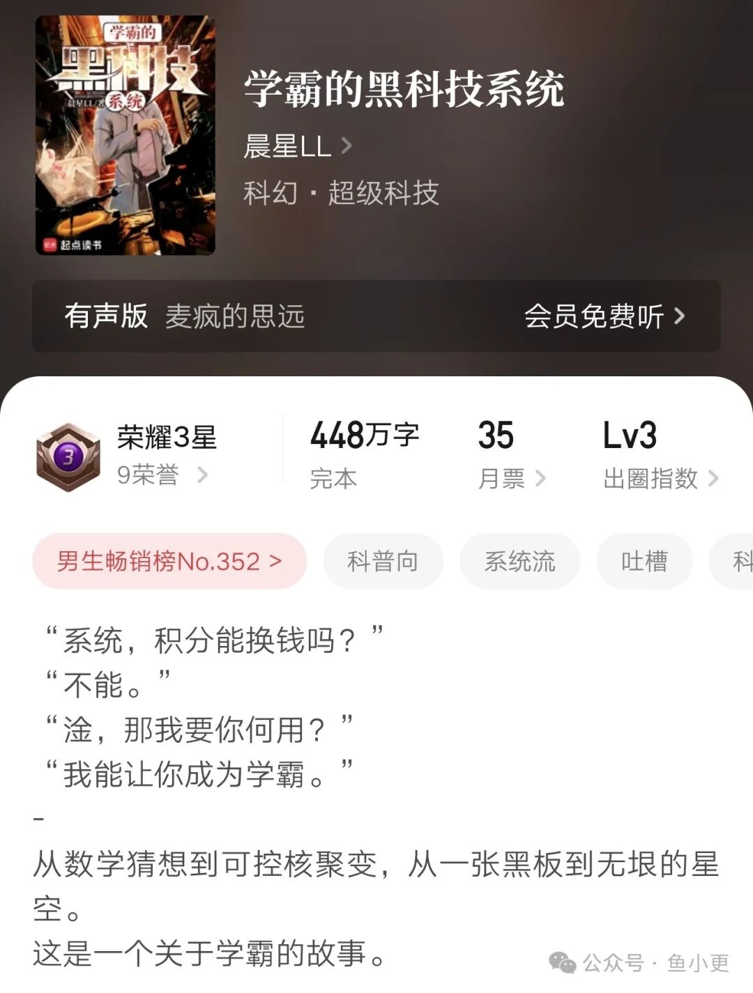 《学霸的黑科技系统》是晨星LL成名之作,不仅获得十二天王之一,还收获不少粉丝,从而为下一本书走向巅峰入白金打下基础。