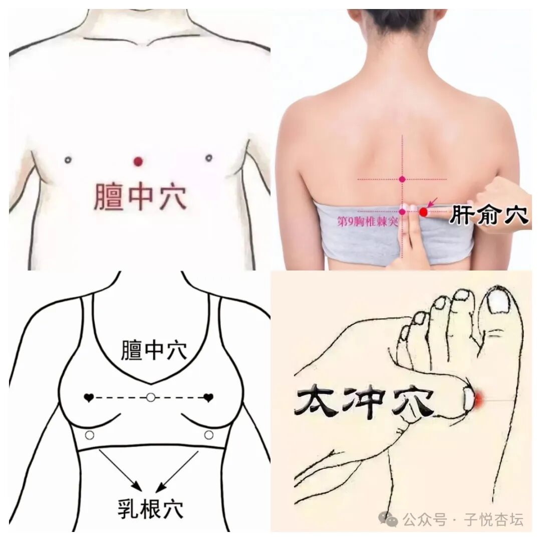 膻中穴、肝俞穴、乳根穴、结节处、太冲穴