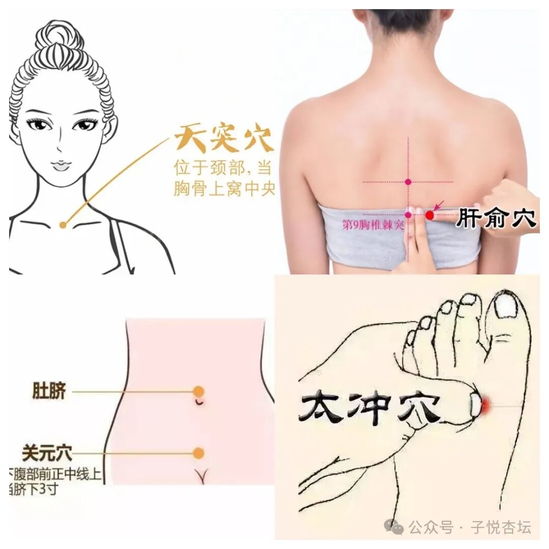 阿是穴(甲状腺疼痛位置)、天突穴、肝俞穴、关元穴、太冲穴