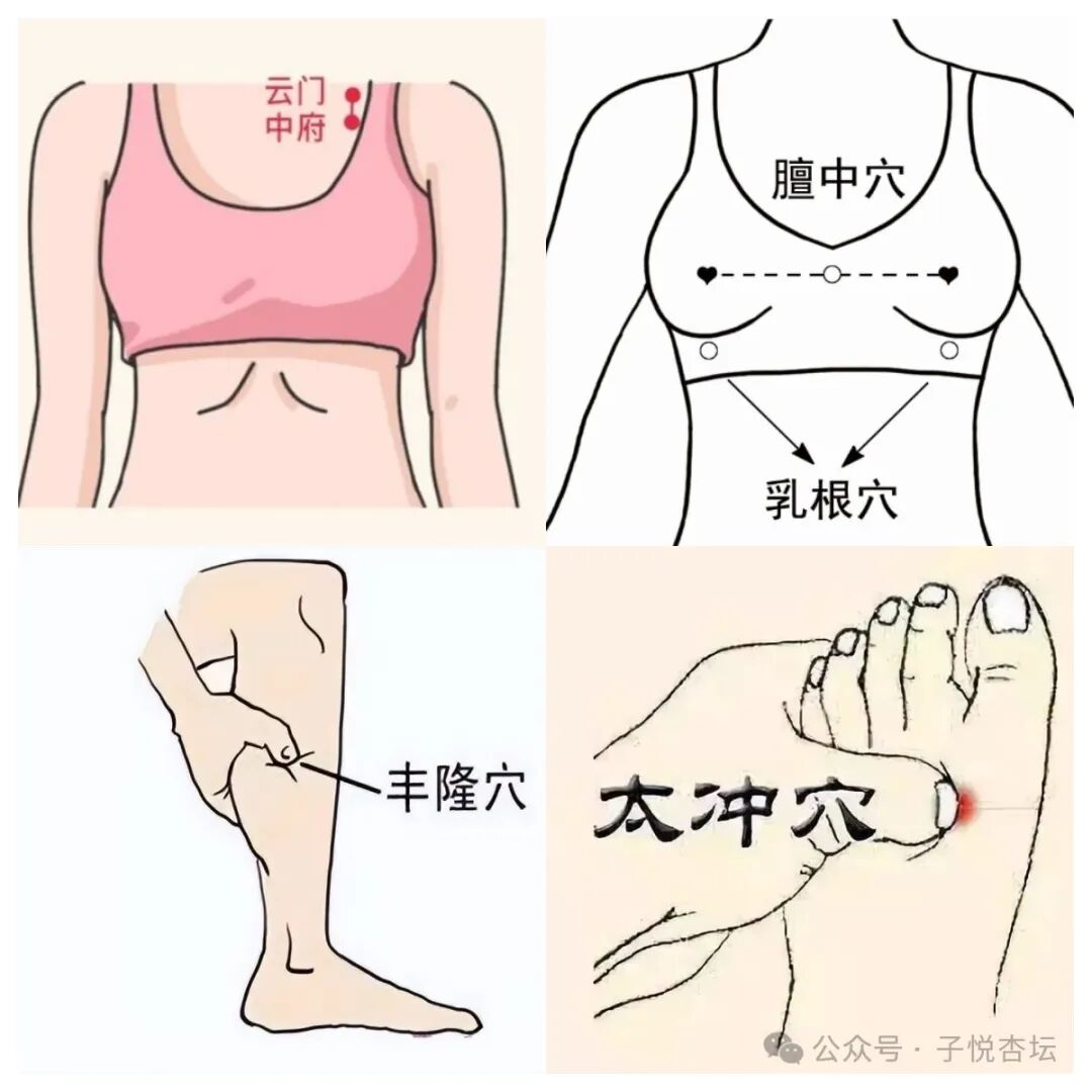 中府穴、云门穴、膻中穴、丰隆穴、太冲穴