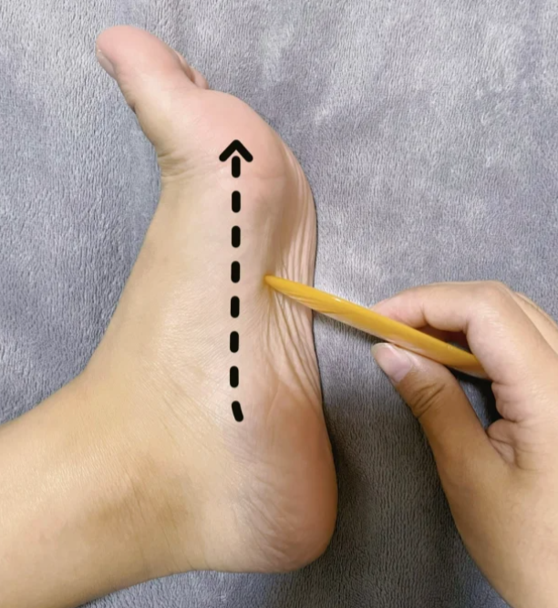将脚趾弓起,可以摸到一条很硬的筋,这就是地筋,经常刮可以降肝火。