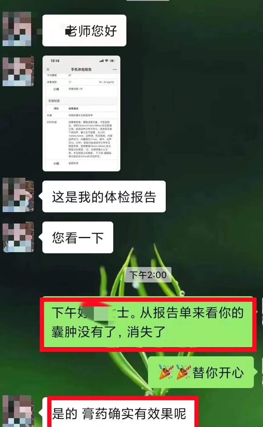 患者拿着方子,回去用了半个月,黄褐斑淡化了,之前那个大的纤维瘤用手摸变小了,在原方的基础上稍作调整,让她继续服药,一个月后,去医院检查,结节已经不见了,囊肿缩小到1cm左右。