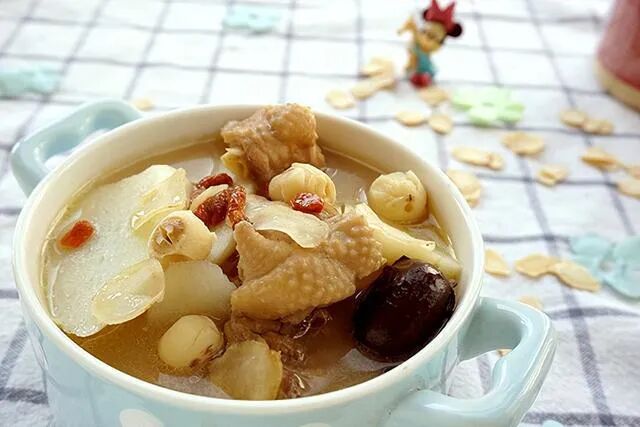 做法:将山药去皮切薄片,核桃仁洗净;净母鸡用沸水焯去血秽,放在汤碗内,加黄酒50毫升,精盐适量,鲜汤1000毫升;将山药、核桃仁、香菇、笋片和火腿片摆在鸡面上,上笼蒸2小时左右,待母鸡酥烂时取出食用。