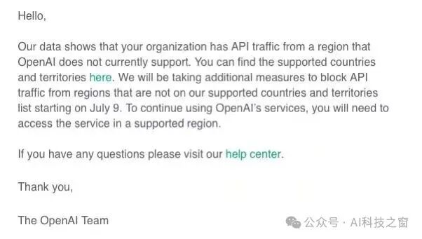 就在昨晚6.25,OpenAI 向大量开发者发送邮件:“您的组织有流量来自OpenAl目前不支持的地区。从7月9日起,我们将采取额外措施,停止OpenAI不支持的国家和地区使用API。”这一决定尤其是对那些依赖OpenAI API的大模型产商而言,基本上是直接封锁!