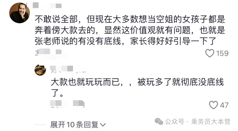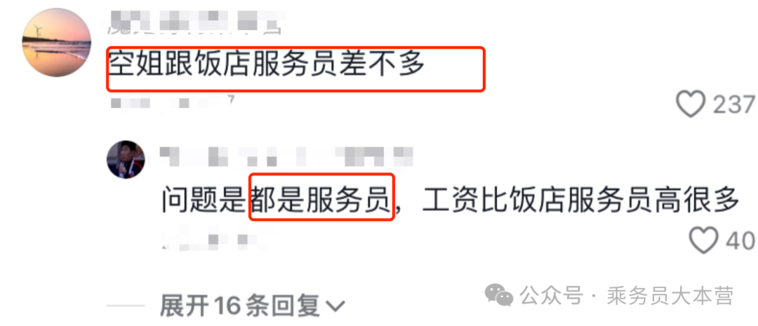 同样的服务行业,空乘不过是在外在上添加一个筛选过程,就被群嘲“青春饭”“傍大款”“不为孩子考虑”“服务员”。
