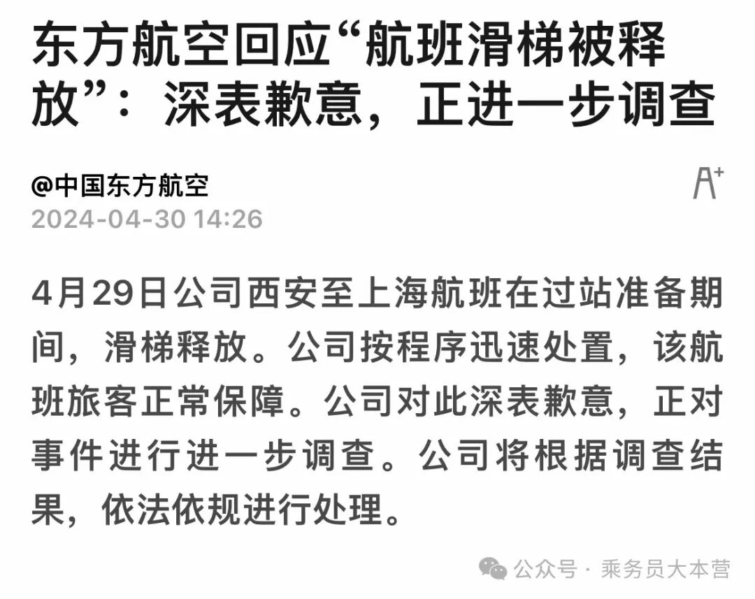 4月29日公司西安至上海航班在过站准备期间,滑梯释放。公司按程序迅速处置,该航班旅客正常保障。公司对此深表歉意,正对事件进行进一步调查。公司将根据调查结果,依法依规进行处理。