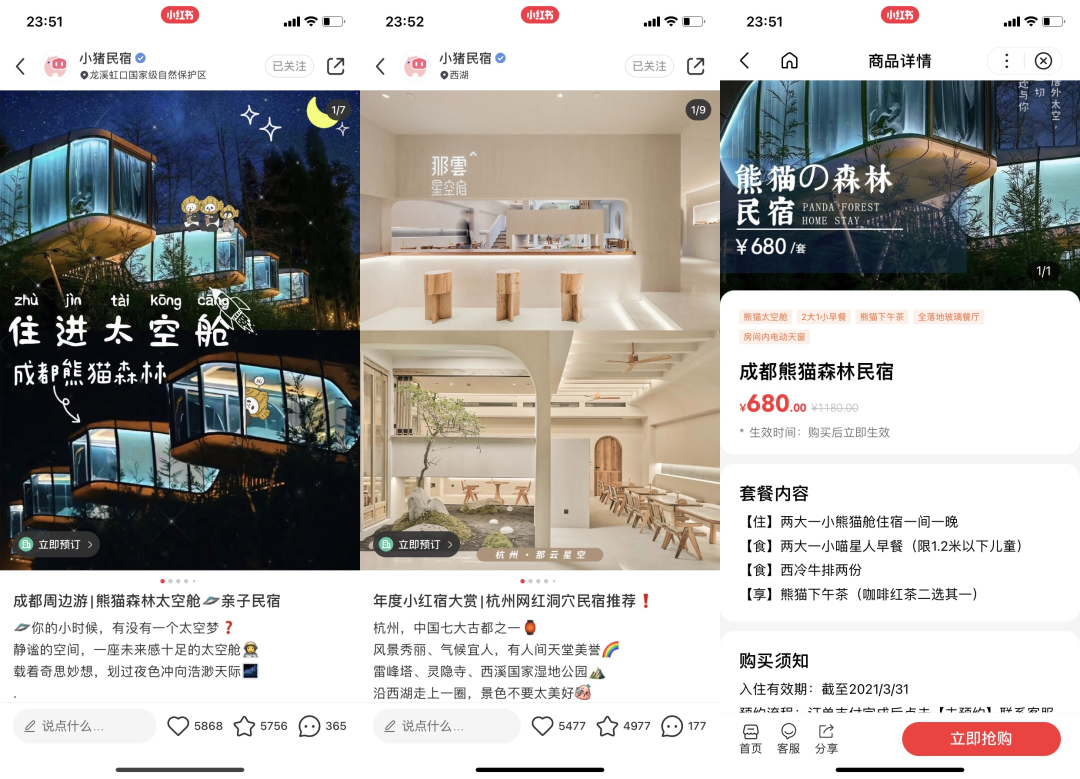 值得一提的是,小红书与小猪民宿于2020年7月达成战略合作。据悉,至今小猪民宿已产出民宿笔记超过5000个,签约入驻小红书的品牌美宿超3000家。小猪在小红书推出9场民宿带货直播,直播的总GMV突破1000万,平均单笔订单金额近1200元,且民宿产品的核销率高达60%。
