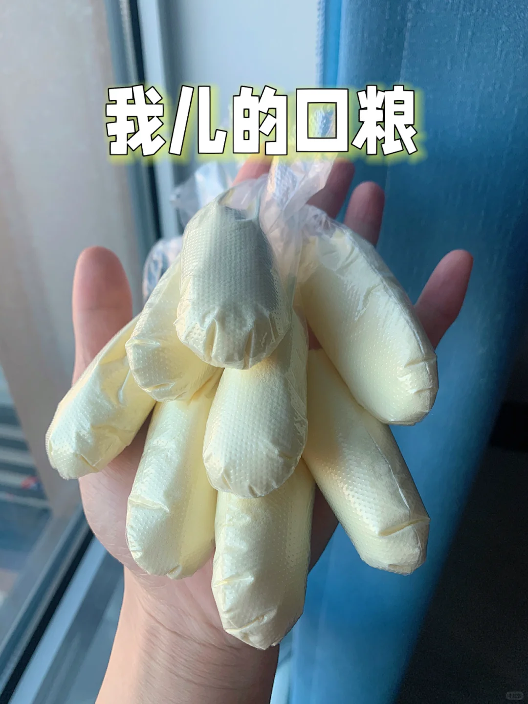 家里的一次性手套就可以变身分装盒,在家提前装好,一个手指基本上能装两勺奶粉,然后再剪下来,封口处系好别洒了,这就妥了。
