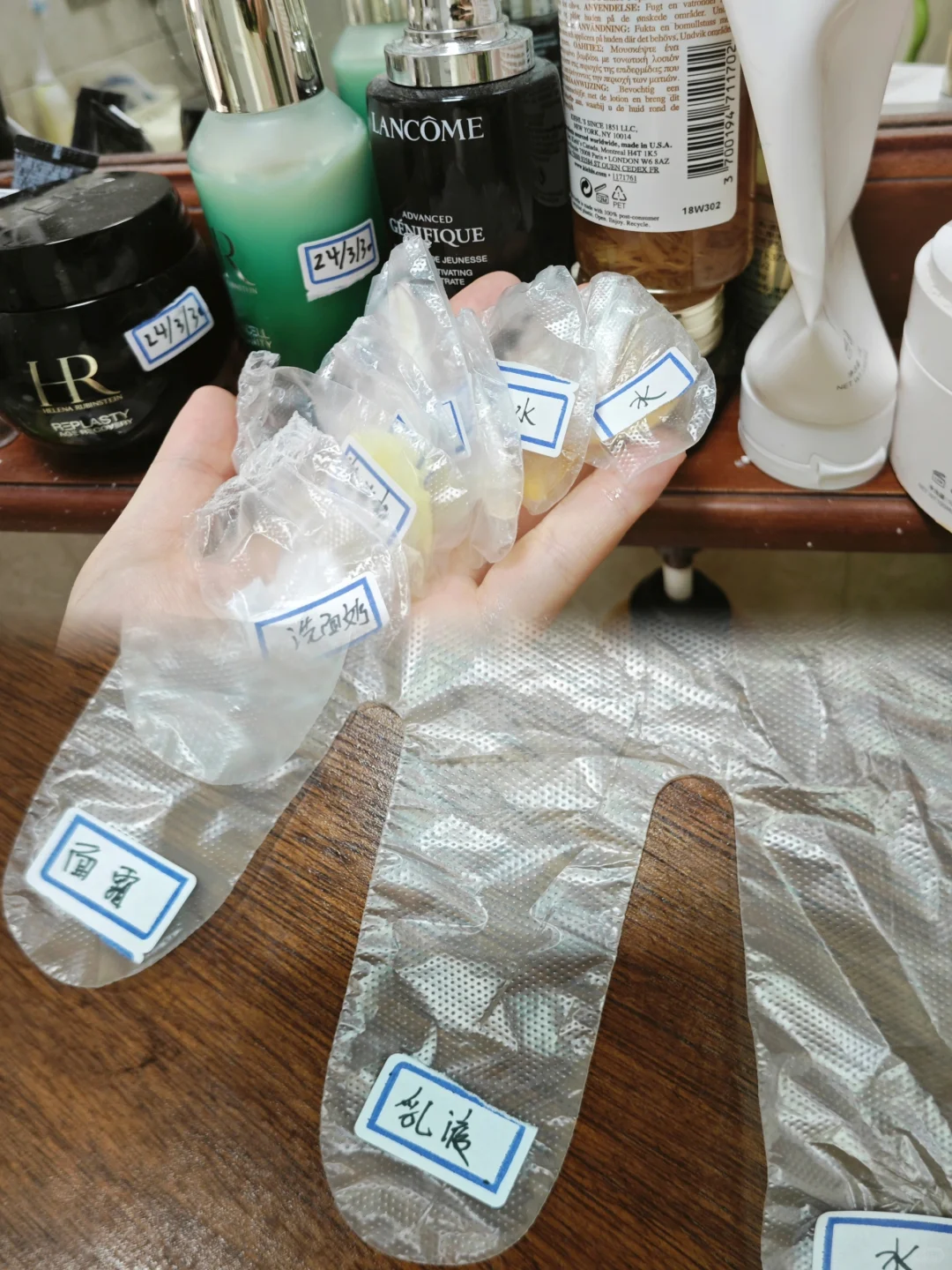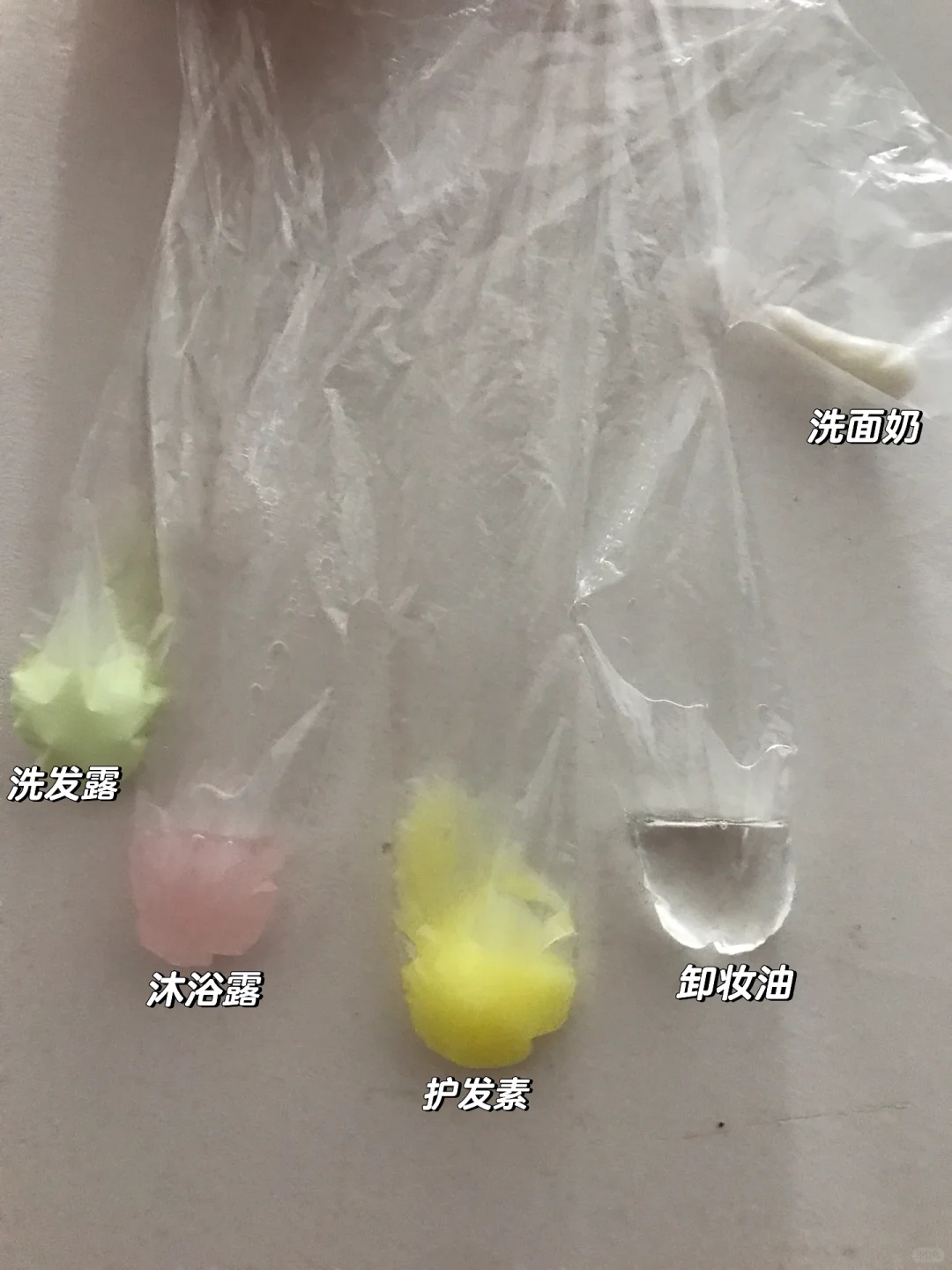 可以将洗护用品放在一次性手套当中,然后剪下来封好口,再做上标记。