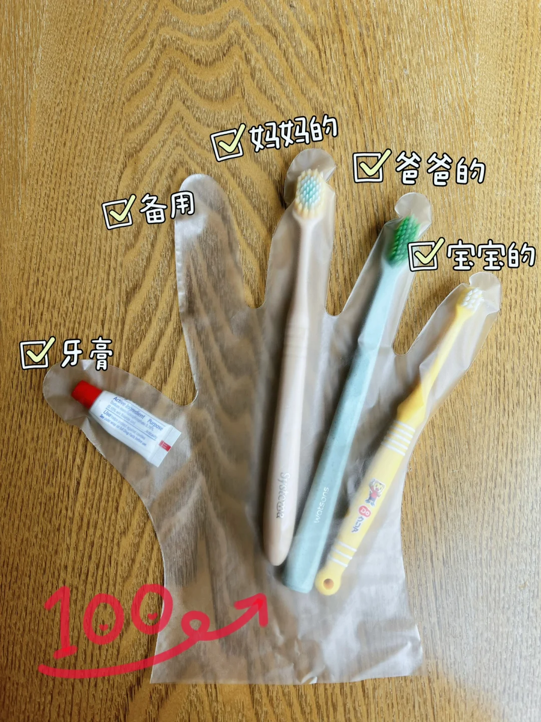 一家人准备出门旅行,牙刷不好携带,买带盒的牙具装太占地方了,真没有必要花这个钱,直接将牙刷放在一次性手套里面就可以了,