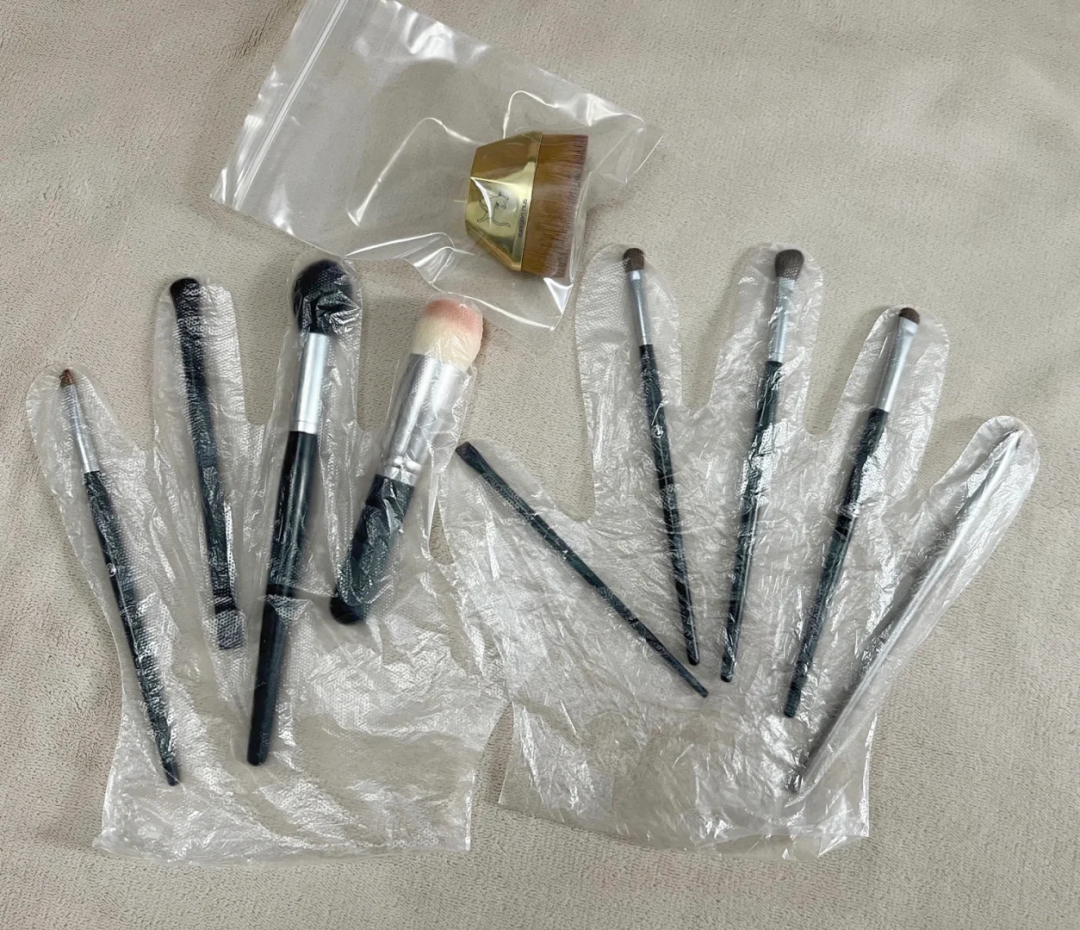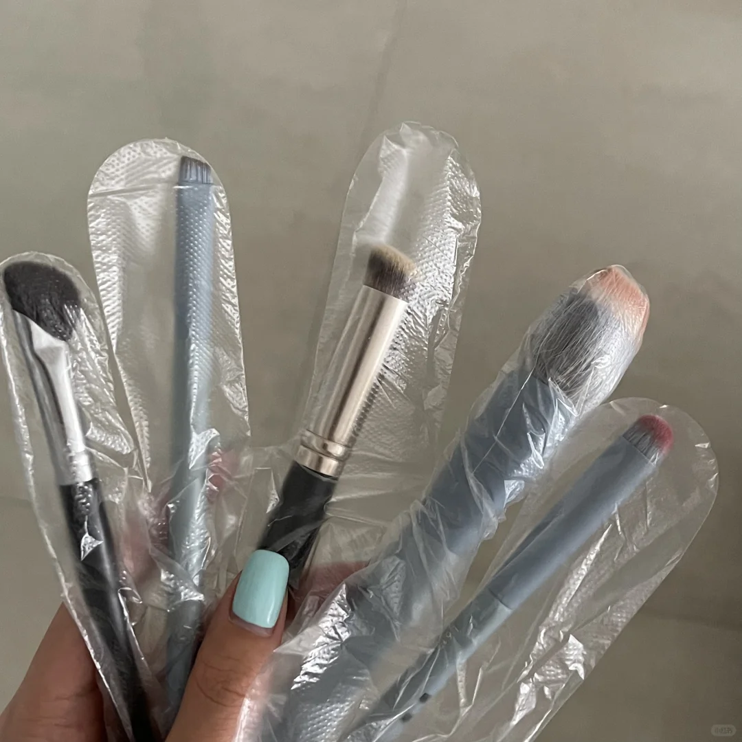 像我们平常用的化妆工具在红刷眼影刷,上面会有粉之类的东西如果将它们直接放在一起的话,很容易受到污染,可以利用一次性手套。