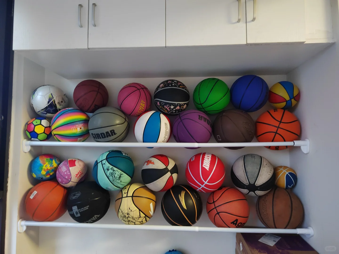 如果你家里有很多球,不知道该怎样放,也可以用这个伸缩杆,用它固定一下。再多的球都能放得下。