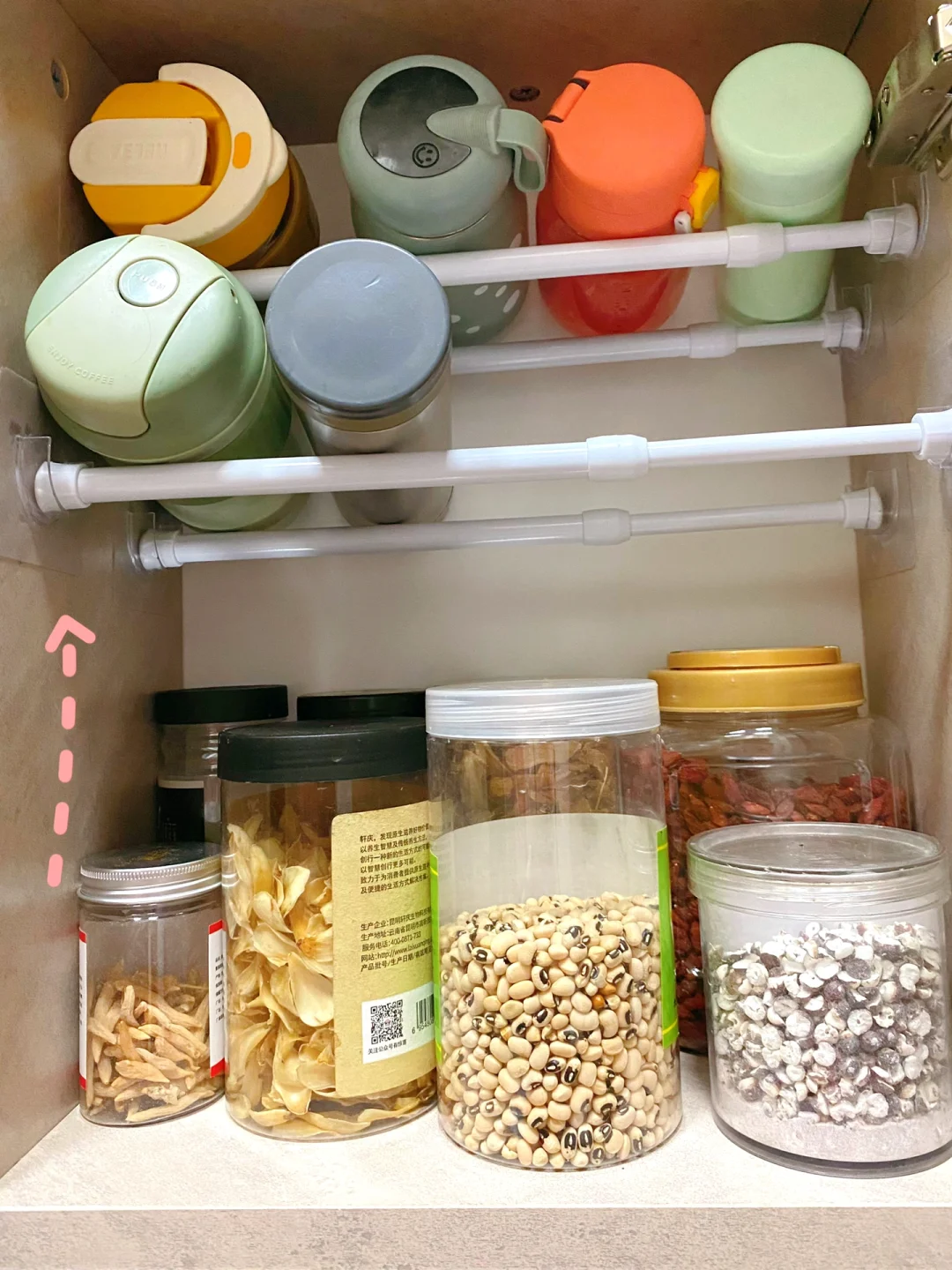 除了尼龙扎带还有伸缩杆,9块9三根的伸缩杆解决家居收纳大问题,把它放在橱柜当中,相当于多了一层隔板,让空间极大化用上,不浪费一寸。