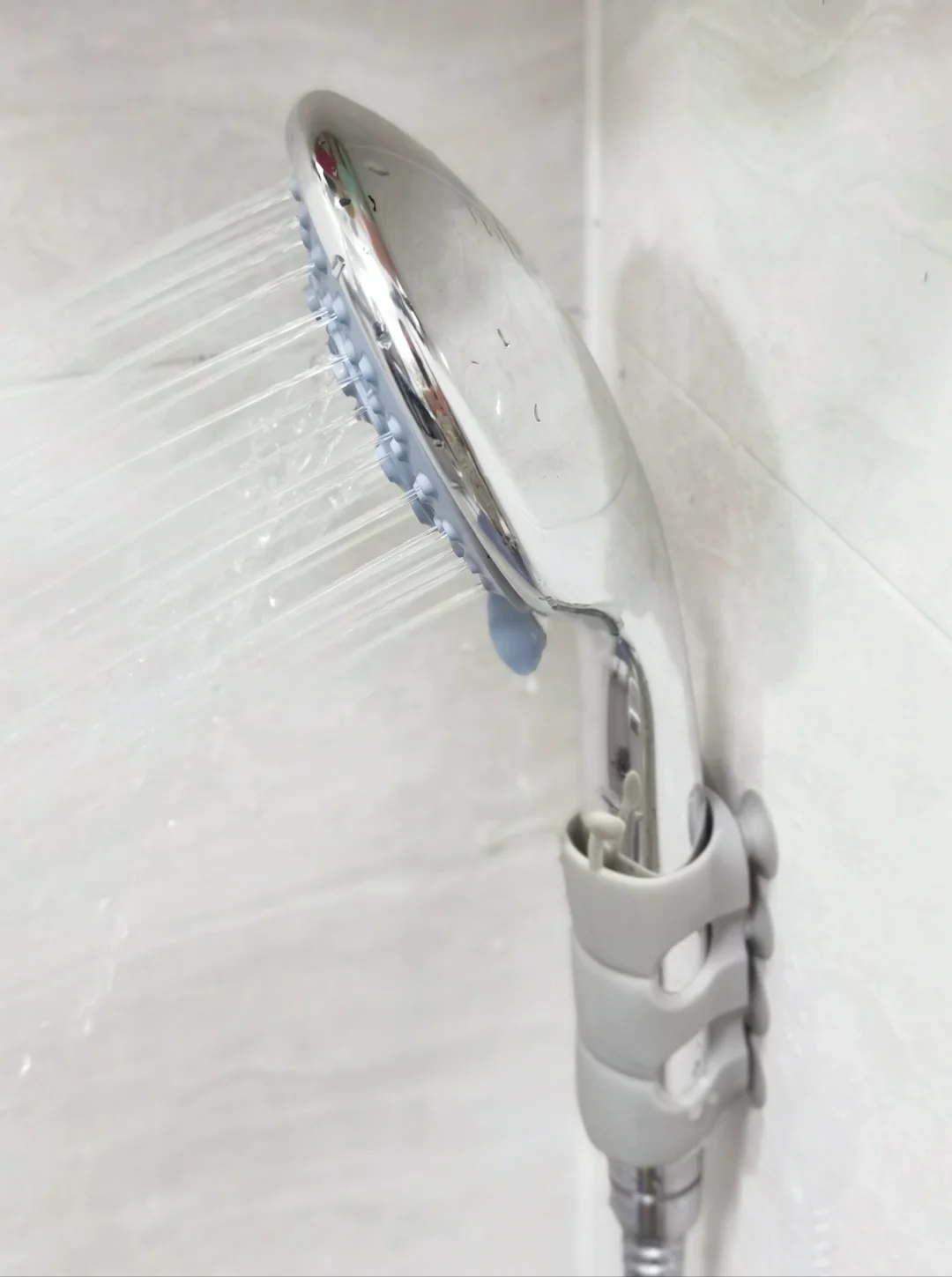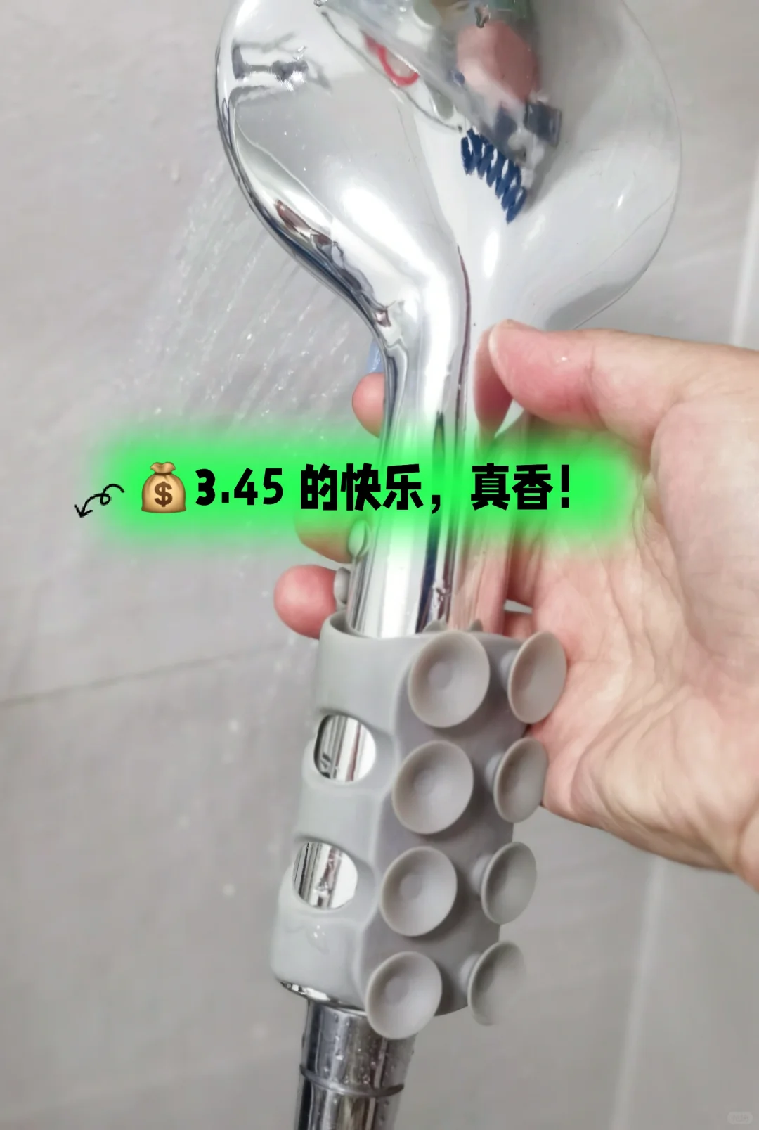套在花洒手柄上,然后就可以吸附在瓷砖上了,给孩子洗澡也可以解放双手了。