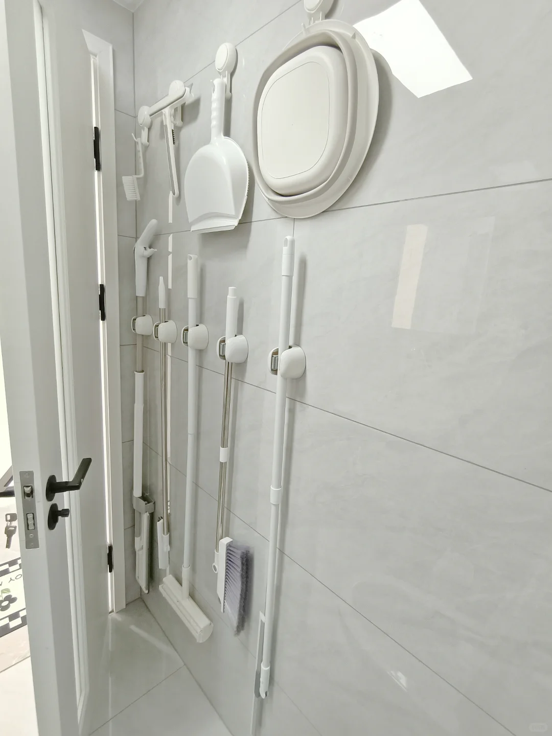 家里的拖把扫把总是乱七八糟的堆放,不仅占地方而且还滋生细菌产生异味,可以将拖把全都收纳在墙上,