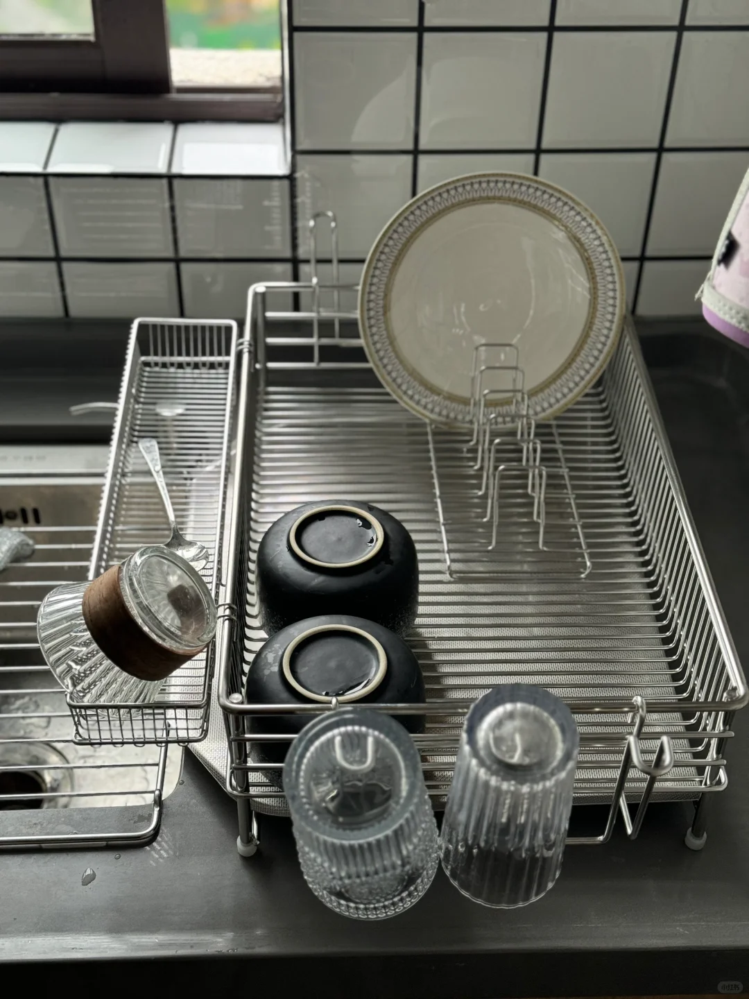 刷完的餐具可以放在沥水板上面沥干水分,然后再放到橱柜当中收纳,这样就能避免滋生细菌了。