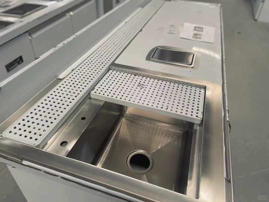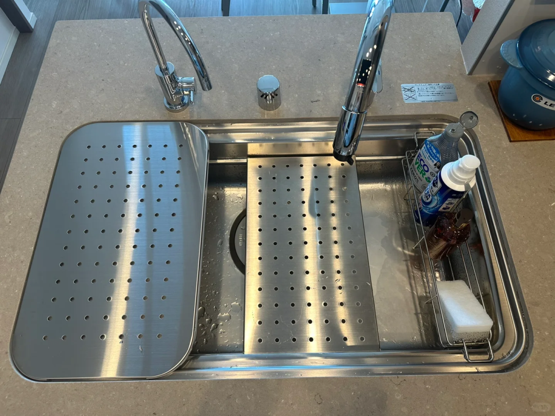 如果你能找到规格和水槽差不多的,还能把它直接放在水槽当中,水槽的盖子盖上之后就是一个可以收纳餐具的地方。