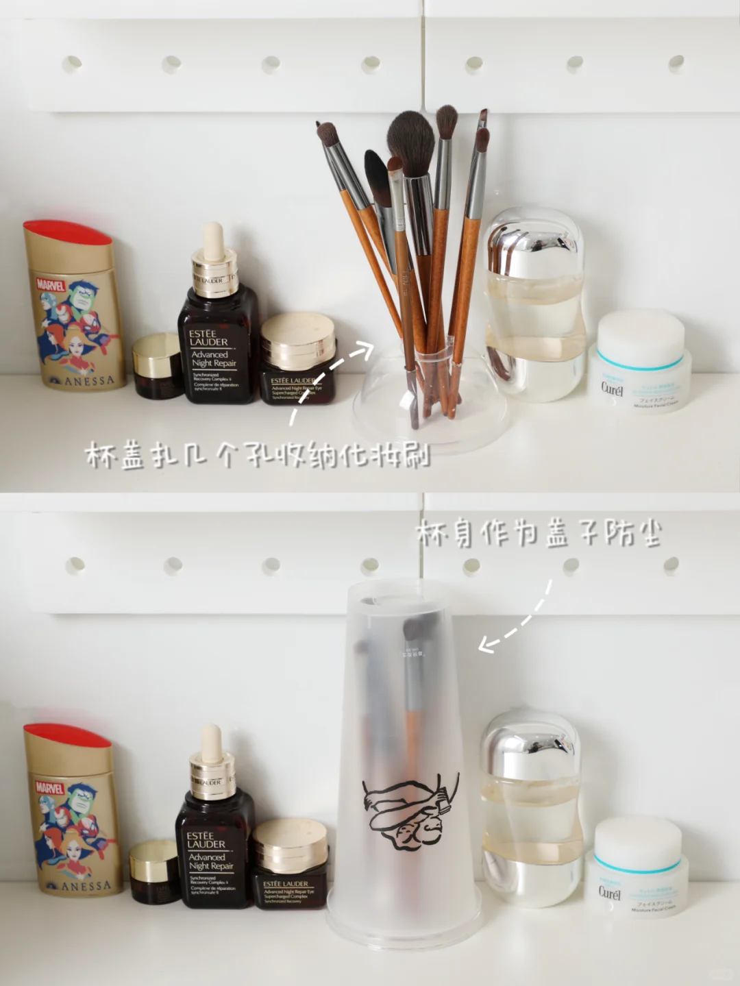 杯盖上扎几个孔收纳化妆刷,杯身作为盖子防尘放冰箱作为收纳盒,收纳小零碎,也可以放蔬菜🍅