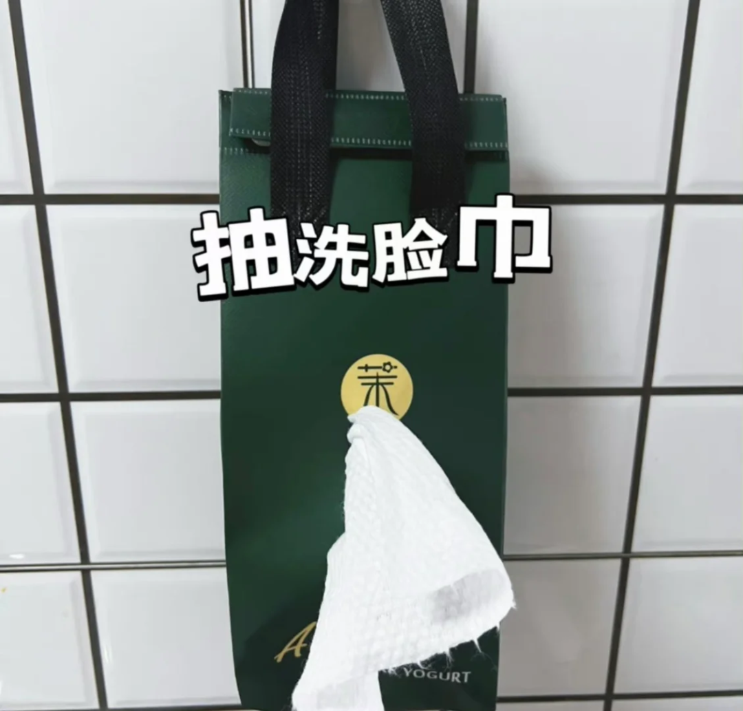 好看的奶茶袋子留下来,把洗脸巾装里面,这样拿取就方便了。