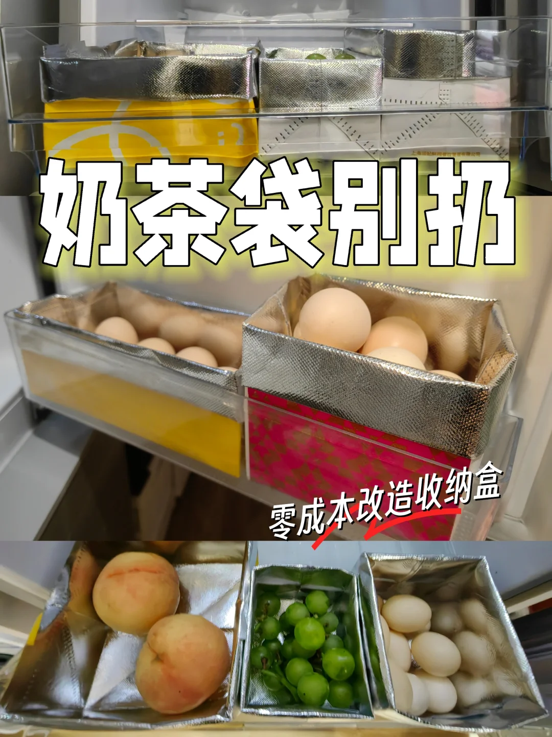 还可以用这些奶茶袋子分装,鸡蛋、蔬菜水果,直接放在冰箱里乱糟糟的,用奶茶袋子装好之后再放进冰箱里,这样就整整齐齐了,而且还方便打扫。