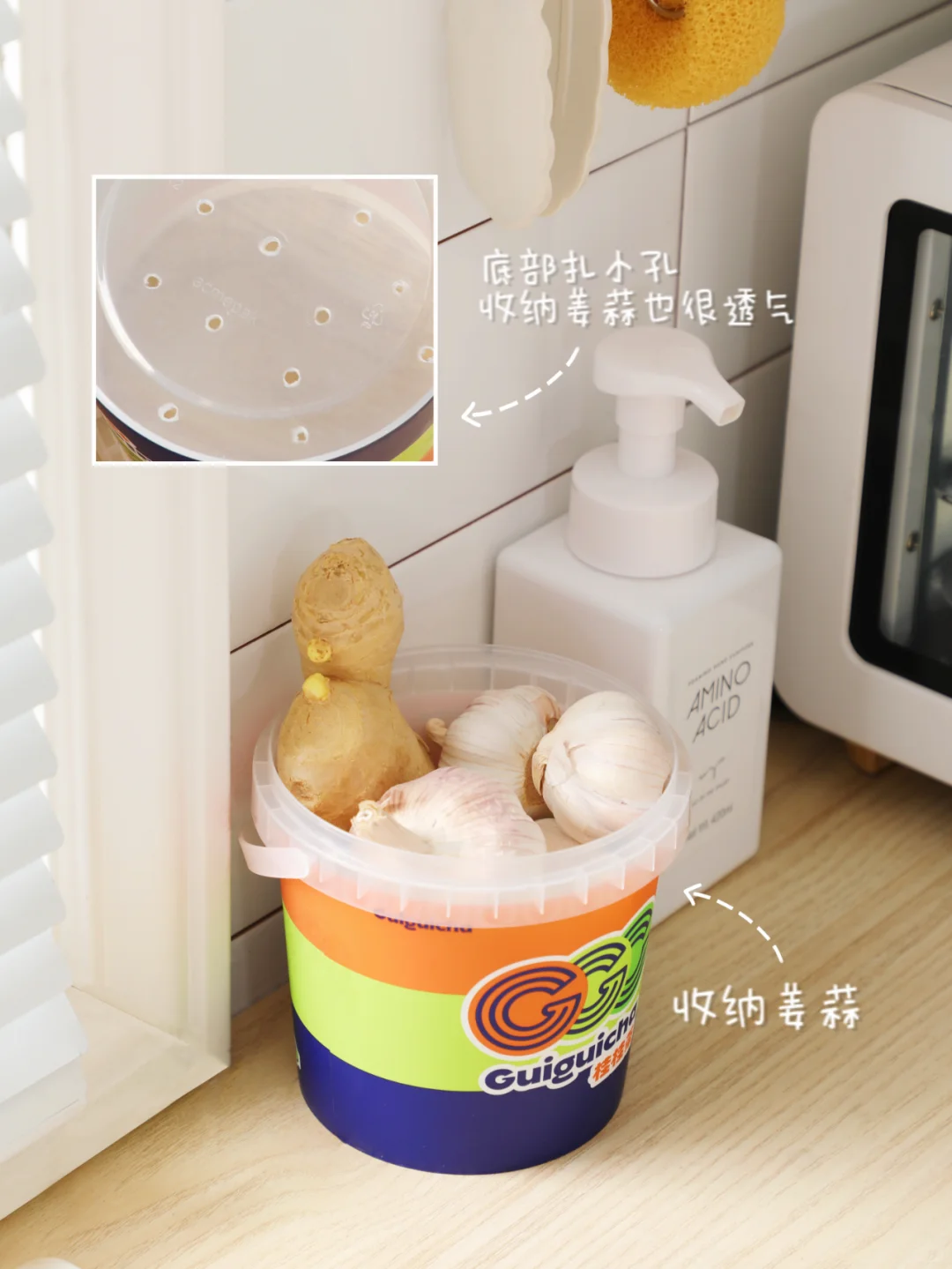 收纳筷子勺子或者厨具,上班或者外出游玩带水果用收纳姜蒜,在底部扎小孔透气用(建议把螺丝刀加热扎,扎的非常平整,也不会造成破裂)