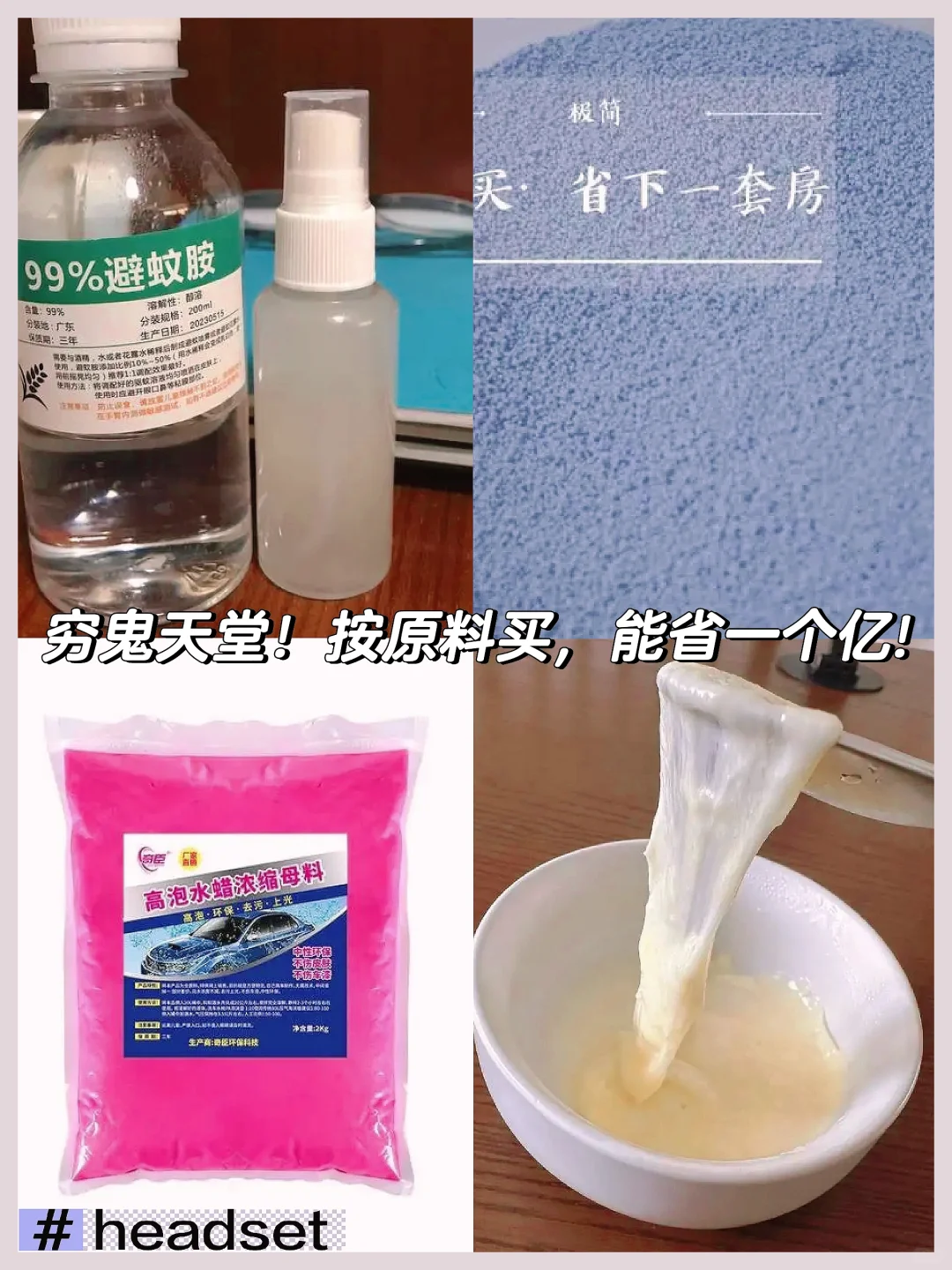 比如你想买花露水,嫌贵,可以直接买避蚊胺,自己用酒精调配,想买爆炸盐,嫌贵可以直接买过氧化钠。