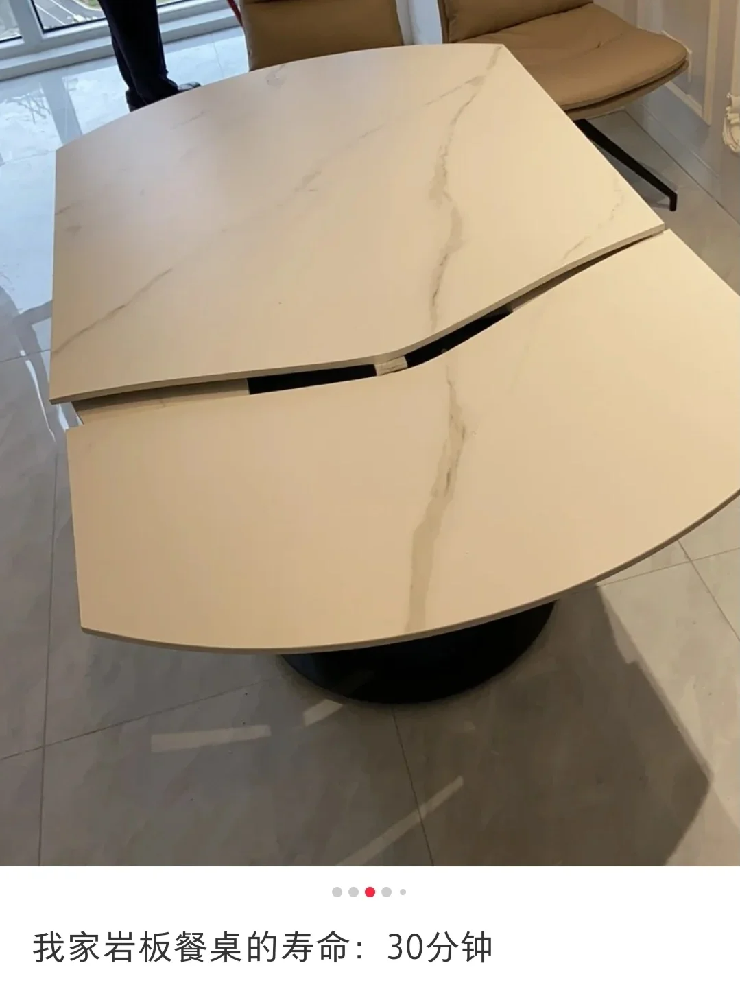 而且就算你买到了真正的岩板餐桌也并不意味着就高枕无忧了。因为岩板本身就有易碎裂的缺点特别是在受到重物撞击或者温度变化较大的时候更容易出现问题。