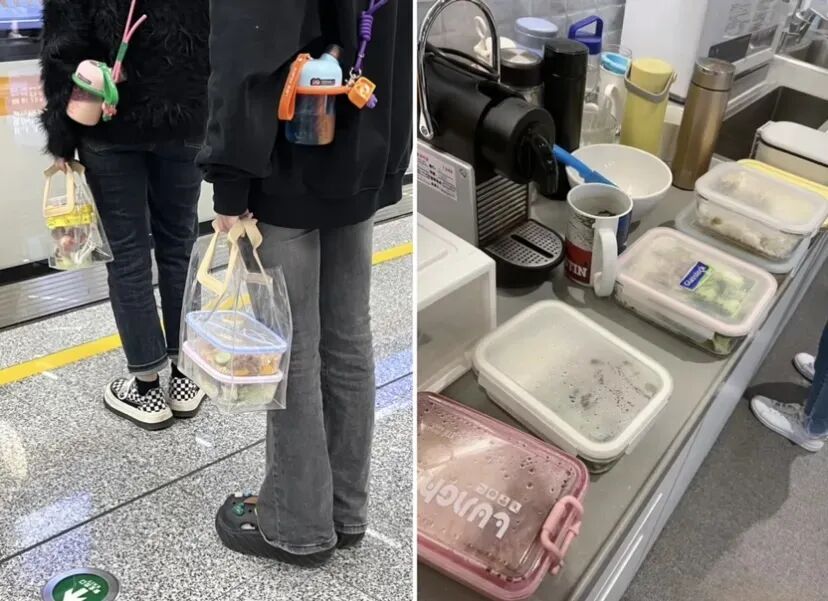 00后上班日常,自己带饭,同时们都是这样,曾经的点外卖场景已经有很久没有见到了。
