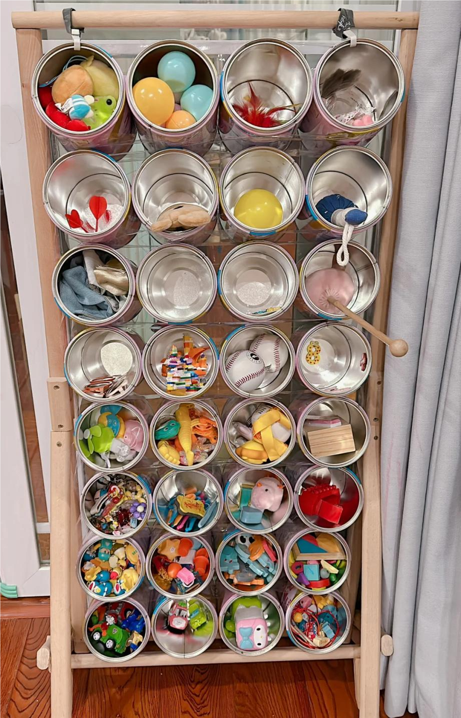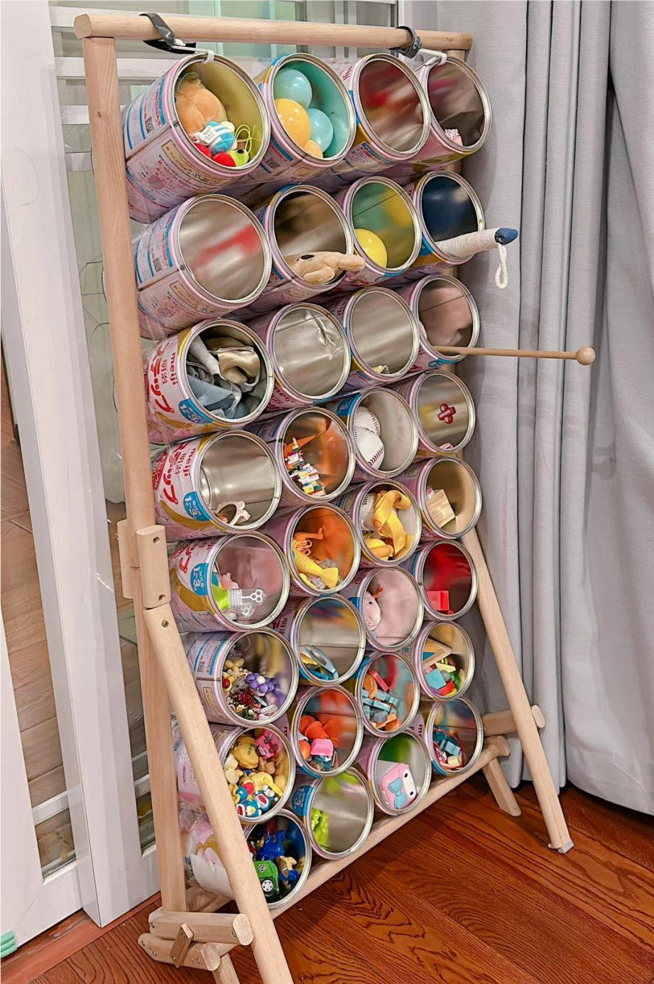 于是将存起来的这些奶粉罐做成了一个小玩具的收纳神器,平常一些七零八碎的小玩具都可以直接放在里面收纳,