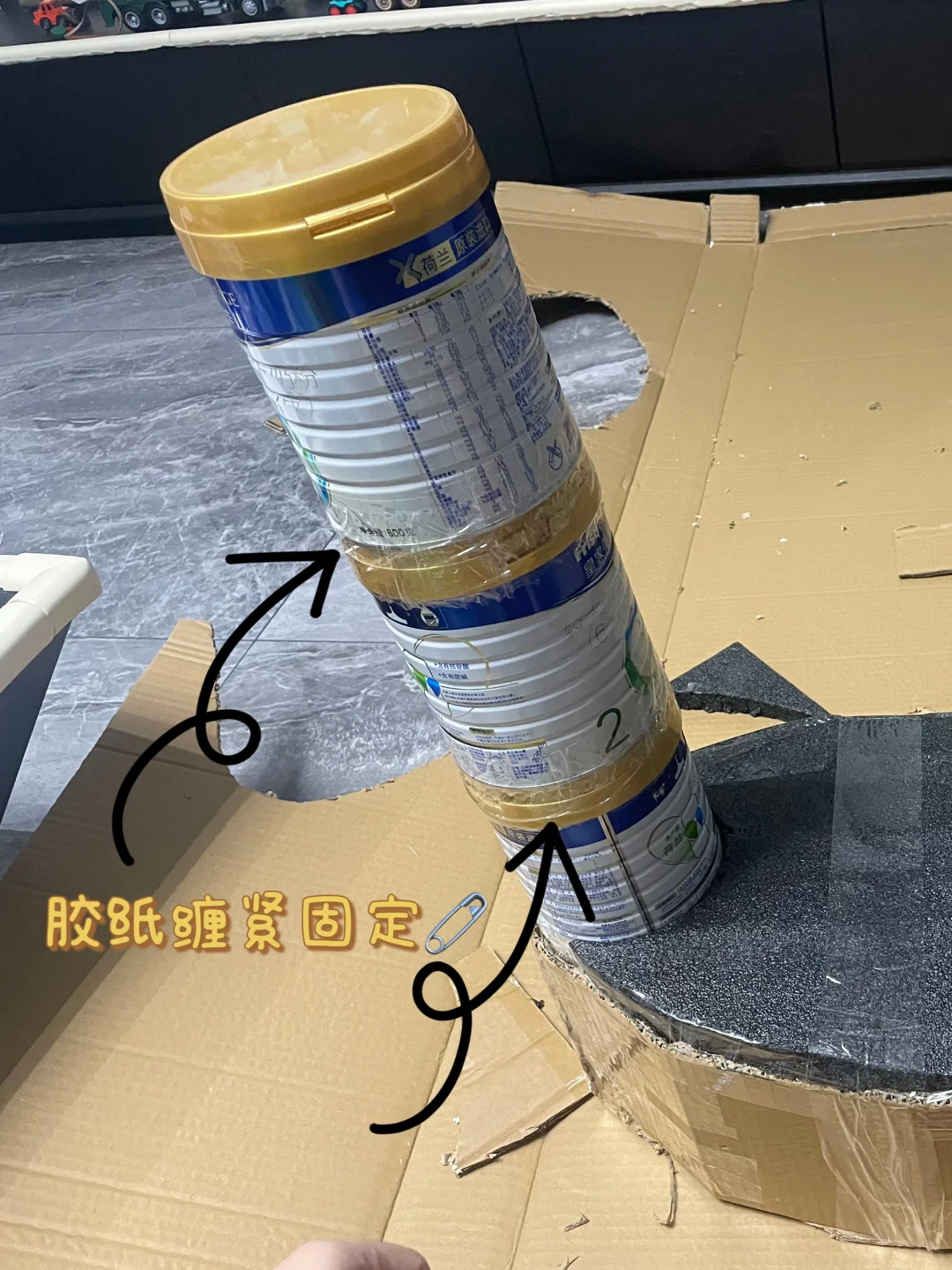 把奶粉罐全部洗干净之后,用透明胶带固定。然后再用废纸板包裹,奶粉罐,用透明胶带加固。