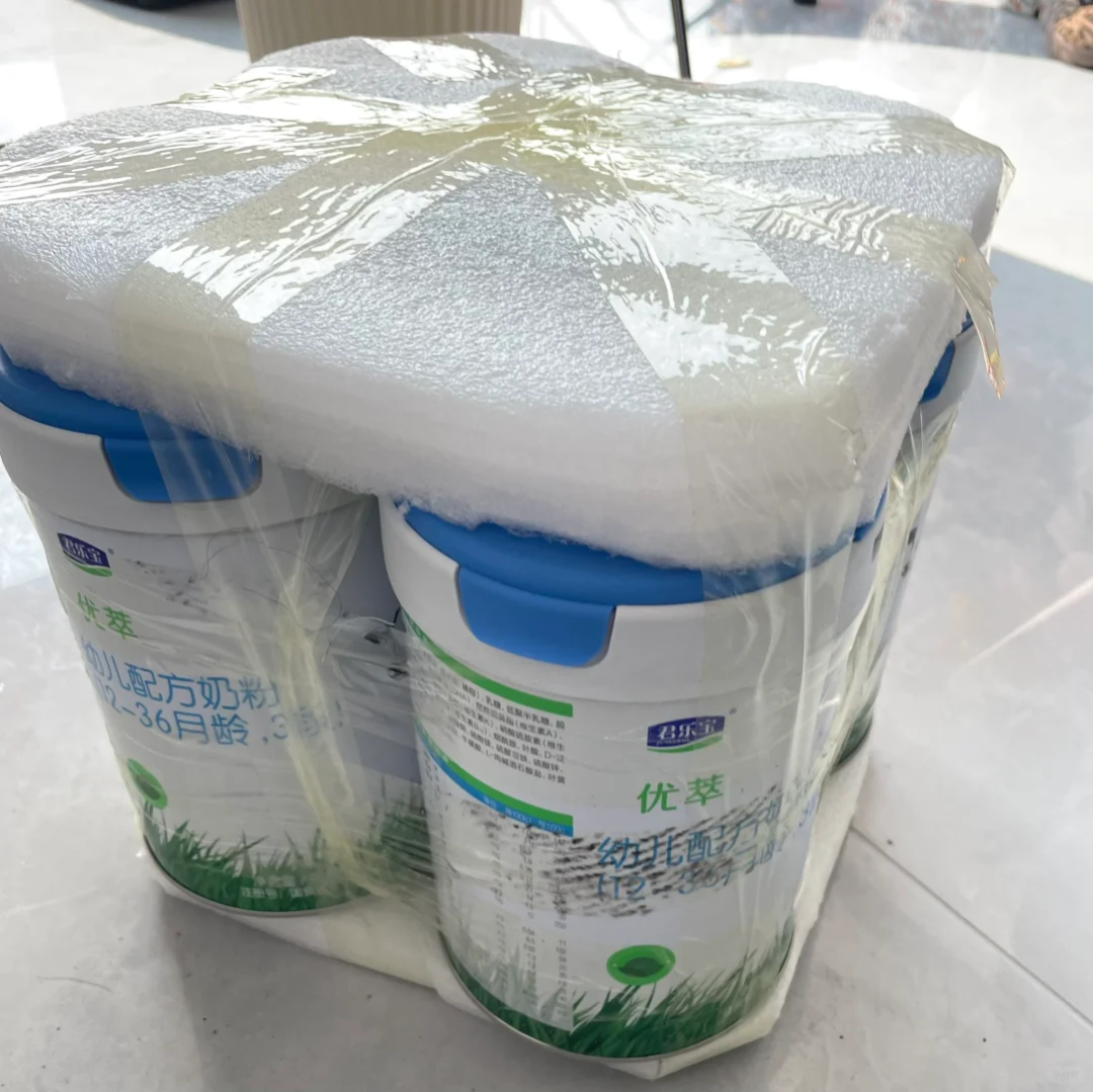 按照自己需要凳子的大小,将奶粉罐全部用胶带固定住,再按照大小将泡沫板裁剪凳子大小放在奶粉罐的上面,再用胶带加固。