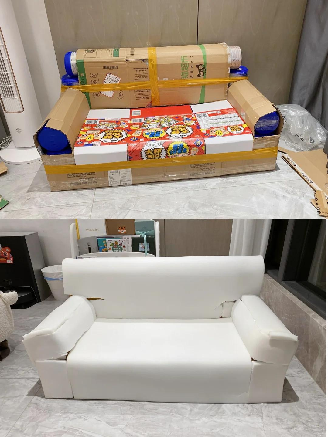 裁剪海绵垫,用胶枪固定在纸板外侧。用里布将沙发包裹,缝好。铺上喜欢的沙发布。