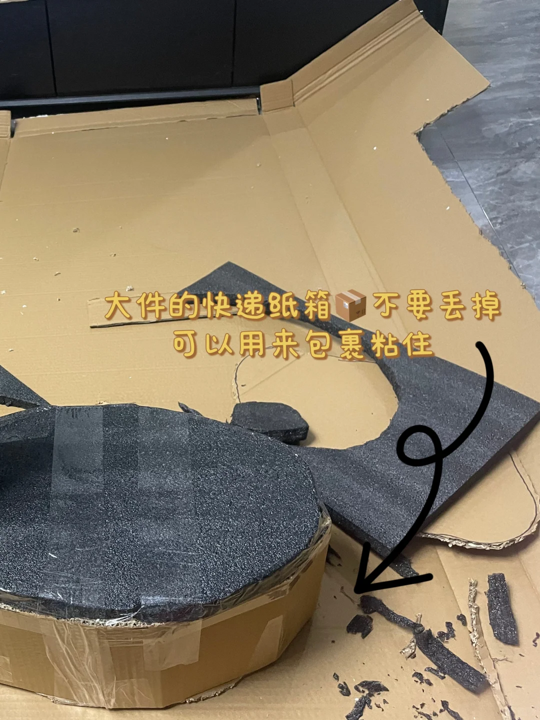 将空奶粉罐按照长颈鹿的形状拼起来,为了稳固一点,可以用胶带缠紧,比较大的快递纸箱不要丢掉,可以用来将奶粉罐包裹住,再做到上面铺上一层海绵。