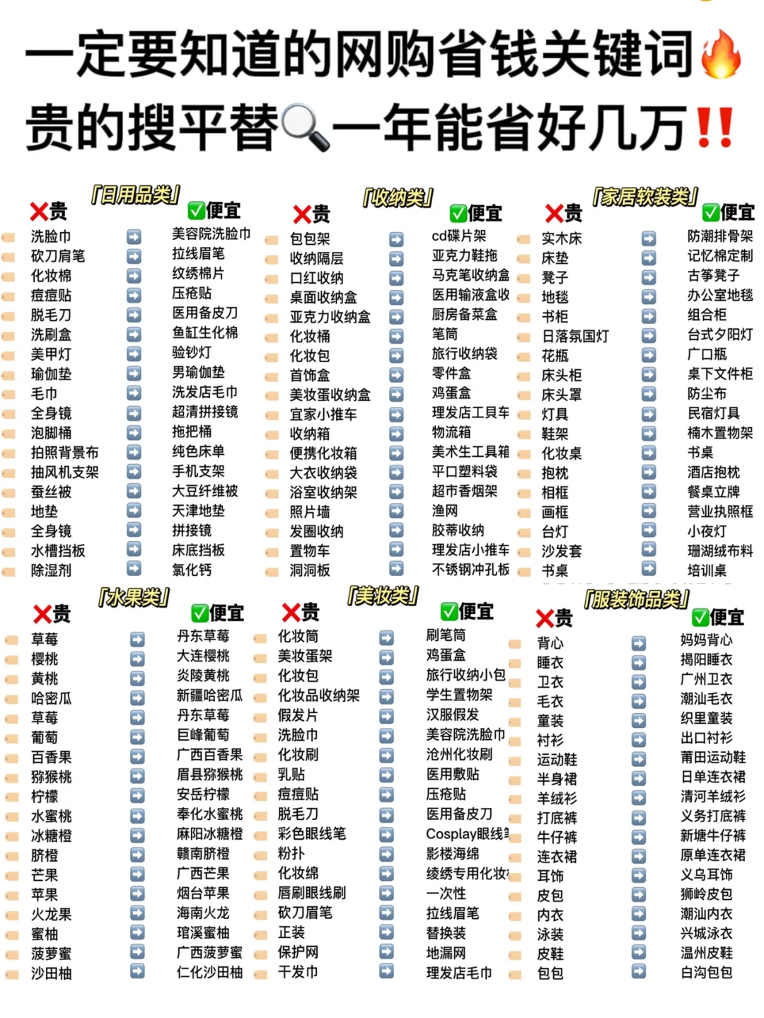 换个词搜,巨便宜,能省一点是一点,记不住,那就码住,整理了这些涉及到的物品,如果要买记得替换搜索词。