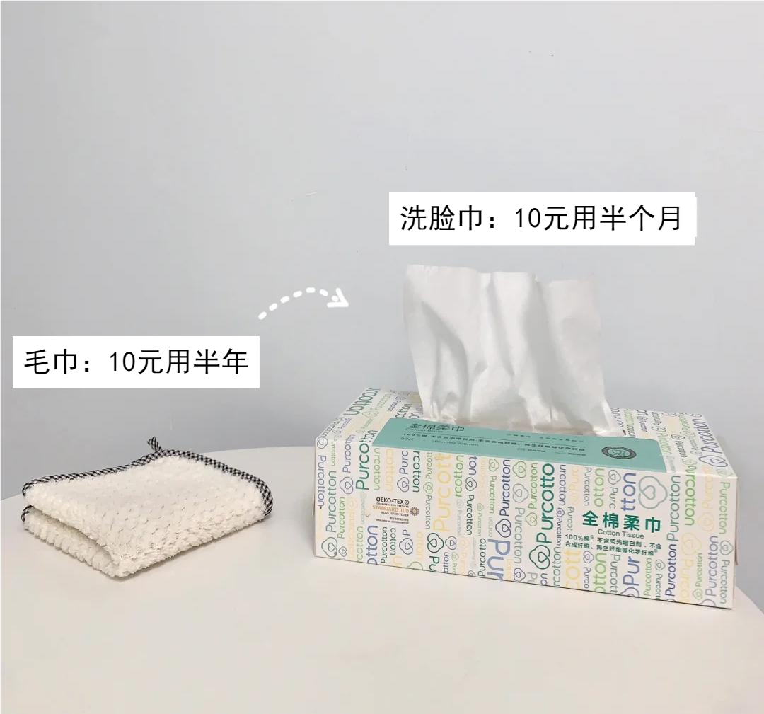 一包洗脸巾10元钱能有半个月,而一条毛巾10元钱能用三个月,如果节俭一些,